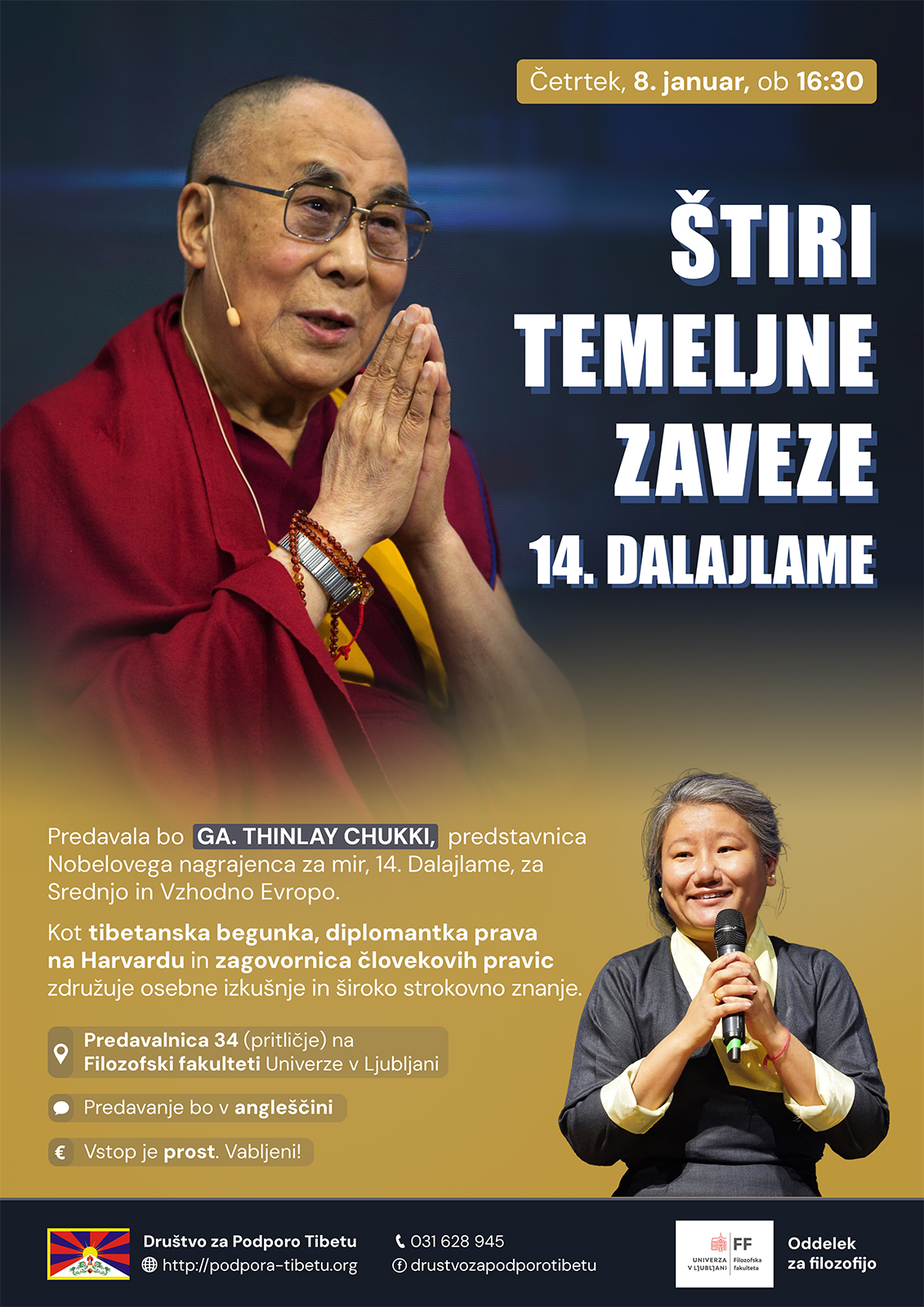 Posted on 25/12/2025Ga. Thinlay Chukki je predstavnica Nobelovega nagrajenca za mir 14. Dalajlame za Srednjo in Vzhodno Evropo. V četrtek, dne 8. januarja 2025, bo ob 16:30. uri na Filozofski fakulteti v Ljubljani (v predavalnici št. 34) predavala o štirih temeljnih zavezah 14. Dalajlame. Predavanje bo v angleščini.