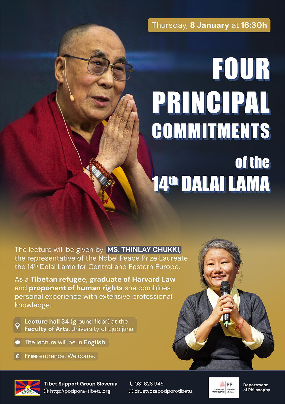 Ms. Thinlay Chukki is the Representative of Nobel Peace Prize Laureate the 14th Dalai Lama for Central and Eastern Europe. On Thursday, January 8, 2025 at 4:30 p.m., she will give a lecture on the Four principal commitments of the 14th Dalai Lama at the Faculty of Arts in Ljubljana (in lecture hall no. 34).